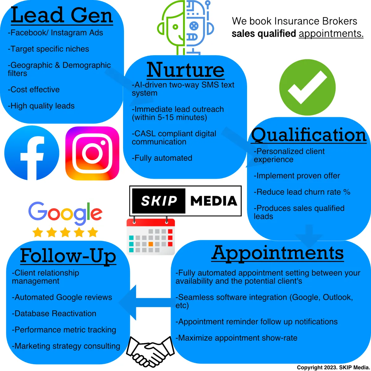 We handle your entire marketing process, starting with Lead Generation & AI driven Lead Nurture, then hand delivering your brokerage qualified Insurance client appointments.